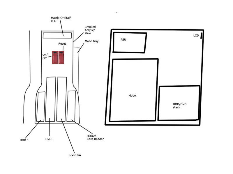I am, by and large, a sensible bloke. However, I have been lurking around here, and a couple of other sites which sadly since have disappeared since the whole modding idea sparked my imagination way back when. So, the project. I have been given my brother's old rig, the bits of which he wants, he has cannibalised (i.e. the HDD, DVD, DVD-RW, and other bits and pieces.) So I've now got a perfectly tidy Athlon rig sitting here with no case. Now I could get a pre-modded effort, but I thought I'd turn it into a learning opportunity, so I can prove (to myself more than anyone else...) that I can do this sort of thing and make me something from scratch. Basically I have an idea of making an acrylic case from scratch. This is because I'm thinking along the lines of moulded/shaped sides to the case. I was wondering how to fix it all together, and after a bit of a natter with my housemate, we came up with the idea of brass wingnuts. Those, with a nice bit of smoked acrylic, with red led's inside the case and cold cathodes, it'll be lovely! So, basically i suppose I'm asking is, where do I start? I can't seem to find anywheres that sells smoked acrylic sheet, I don't know what thickness I'd need for the case, and I'm generally not sure where to go from here. As I say, these are all ideas whirling around my head at the mo, and so I'd like some advice/feedback on me ideas. Design concepty sketch type things on the way. Thanks guys, Joe