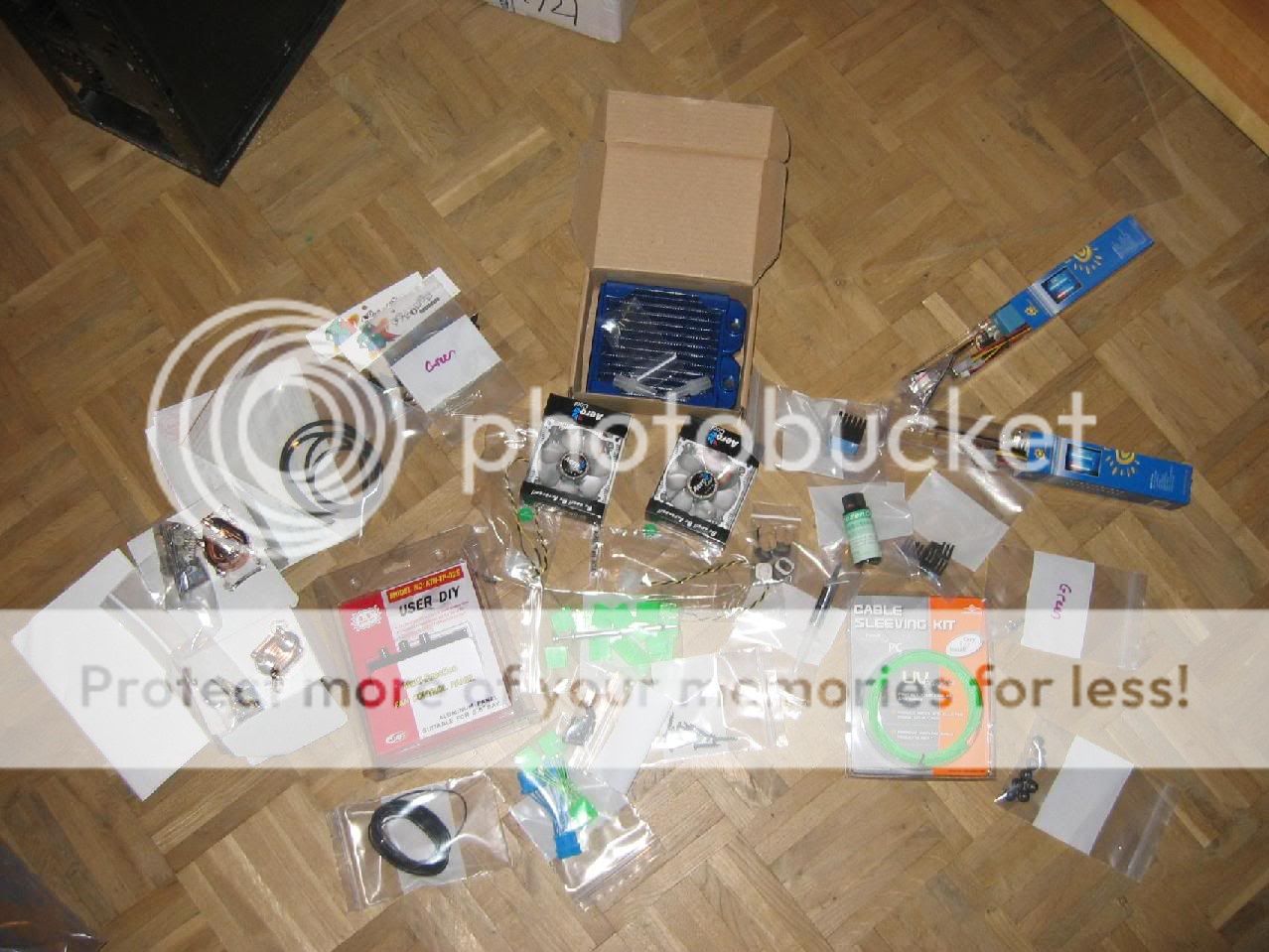 Thanks y'all even though I don't quote everyone who replies to me, doesn't mean that I don't appreciate the relies I love all replies (as long as they don't say that my project sux ). Of cource it is ok just don't pick the exact same design as I have True true! Thanks for the ideas alianyn! they are really great! I especially love the one with the cave! But I think I will wait.. maybe in my next dragon mod Here's a little photo session, starring the parts I have bought Here are the sleeving kit and the change over parts Here are the TDX block, Maze4 NB block, and the DD PRO rad. Here are the heat sinks I will use for the SB and some of the mosfets surounding the cpu Here are the fans, fancontroll, screws, grommets, fan grills, etc (ohh How did I get my parts to "pose" like that? ) Here are 11 Leds (one with a chrome housing). they are "green" but looks more yellow to me, and they really couldn't light up a **** even if it was wrapped in aluminum foil! the pic also shows two of my new 10cm uv catodes.. Just for fun I put the case together as is is now... the sidedoor is primed and ready for another coat of primer before I shal start the color spraying