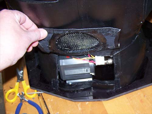 Since I made additions to both the head and the keyboard (both were supposedly done) I felt that an addition could be made to the abdomen window to make things better too. I painted and installed another strip of flexible red LEDs that will sit inside the bottom base of the belly and light the area around the processor block up to the video card. http://www.casemodgod.com/Hell166.jpg I also decided to upgrade the chest section as well by adding two meteor lights that I cut up to fit inside, they will shine down into the abdomen window section and provide an animated lighting effect to offset the lasers in the head. I used black vinyl dye to make the box, switch and button match and then installed the modded cover plate behind the section of leather with velcro on the top and bottom... Everything plugs in on this side. Some of the components like the mouse and keyboard plug into the PC beneath the flap, for the monitor plug I made its own cutout (as seen below). The cover flap was actually one of the biggest design hurdles of this project, but I think I made good use of space by having nearly EVERYTHING (external and internal) plug in from this area, including the monitor and also control of the meteor lights. http://www.casemodgod.com/Hell168.jpg For the back cutout I used a black mesh speaker grill that is held in place with liquid electrical tape, it looks a lot better than the black plastic mesh I had wedged in there before. The top is glued down and the bottom is held down by velcro, it makes for easy access to the pump and is also the air intake for the PC. http://www.casemodgod.com/Hell170.jpg I painted the PSU tray with black enanel paint and changed out the silver thumb screws for black. Below is the back of the beast, one of the things that I decided early on was that it would have to look good from all angles, including the back. It was tempting to just ignore detailing the back since it would hardly be seen but now that it's done it really paid off. Just waiting for the springs I ordered to arrive so I can fix the tubing and leak test it.