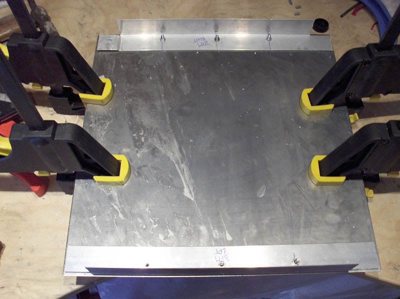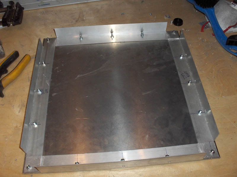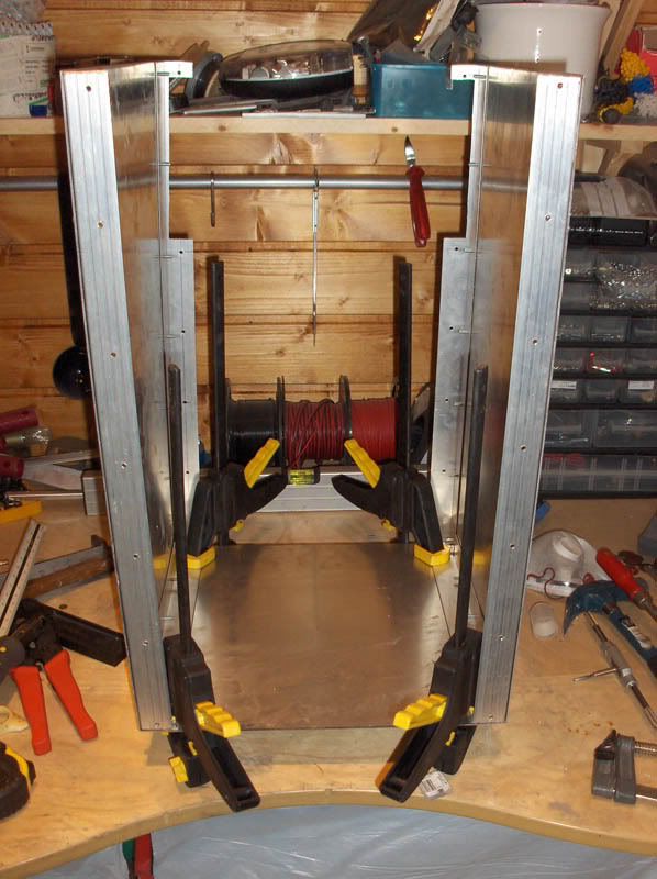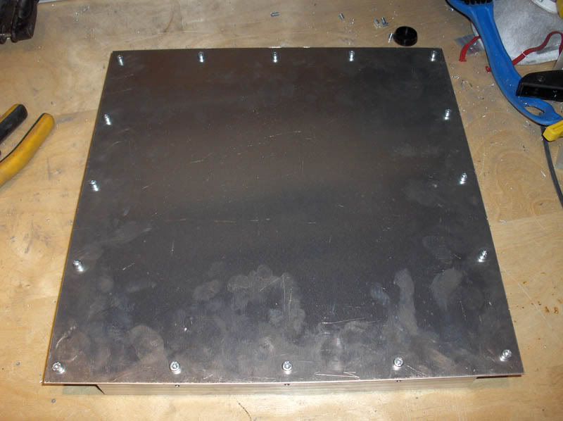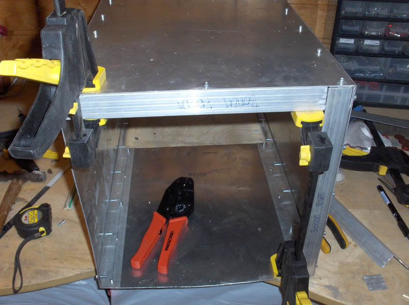 Okay. Here is the update folks. Getting the bottom done was more work and a hell of a lot more time-consuming than I anticipated. A good six or seven hours of work went into this, and still it is all quite course and rough. I foresee a lot of sanding and grinding in my future Anyhow. To get the bottom done I first had to do up some angle-bars. Measuring up and cutting them is easy enough and pretty straight-forward however, I still managed to fumble this a couple of times. Which of course added to the total time spent. Here we have the first angle-bar marked and ready for cutting. Notice how my desk is remarkably uncluttered at this point A close-up of the same thing. I am going for the quick and easy approach, knowing that I can rectify any - well, most at least - aesthetic issues at a later date. I also needed to cut some off the edges to allow the angle-bars to accomodate the bars already holding the sides of the case together. Of course all these angle-bars will be joined together at some point, which will strengthen the structure further. And then, of course, some trimming to the edge due to poor measuring. Afterwards we have a nice and snug fit. That is one down, three more to go. By now I should think you get the idea; the quick and easy approach Having learned from my previous fumbles with the measuring-tape I feel I should show you all the importance of double-checking. Cutting this bar 5mm too short would have proved catastrophic as this was the last of the angle-bar I had - and the hardware-store was now closed for the weekend. Luckily I re-checked it and was able to rectify the potential problem. Repeat this process three more times and here are the results. Four rough-and-ready angle-bars. Now... where did I put that bottom plate? After all this I had a celebratory glass of red wine and then started on the demanding and precise process of fastening the angle-bars to the sides of the case. I chose to screw it to the sides prior to the bottom in order to make positioning the latter easier. Sticking the bars to the sides were just a manner of clamping them to the edges of the sides, drilling holes, threading them and then screwing it all together. After a lot(!) of clamping, measuring, positioning, drilling, threading and screwing ( pun intended) the angle-bars are finally mounted to the case. Having slowly lost some of my faith in the 3mm of threads in all my threaded holes I have decided to do something about this. I had a lightbulb-moment at work today which I will implement as soon as the case is ready for it. This wil also get rid of all the nasty screw-ends protruding into the case at the moment. However, this is some time in the future. Okay. So now I used the "walls" as a guide of how to position the bottom-plate as the bottom-plate were intentionally cut a little bit too large in order to give me some excess material to play with. You never know after all how these things turn out until you get to the point of actually putting it all together. Turned out that giving myself a couple of mm on each side was a good thing - just adds to the sanding needing to be done later. Skipping ahead a little. After being satisfied with the positioning of the bottom-plate, and having clamped the bottom angle-bars to the bottom-plate, I removed the walls and started drilling and threading the bottom to the bars. This was done in much the same way as the sides, but with a lot more care and attention to precision. Having the bottom getting mounted crookedly would be nothing short of catastrophic at this point since there are limits to what can be rectified with sanding down. Two of the sides are done at this point. After this I re-mounted the walls and got the final two bottom angle-bars positioned and clamped down. Then I removed the walls once again and resumed drilling, threading and screwing them to the bottom-plate. Nearly there now. Then, some time later, the bottom is ready to be mounted to the case. Looking quite good now, and at this point I had to call it a night as this was sunday and it was getting quite late. Here are two shots of the completed bottom-plate from the inside and the outside. That is it for now. I am still eagerly awaiting the delivery of my new hardware which, as I said, have been postponed until the 22nd. This means I will not have it in hand until the 27th at the earliest taking postage into account. Oh well, the case will never get done in time for this of course, but still; new hardware is always welcome
